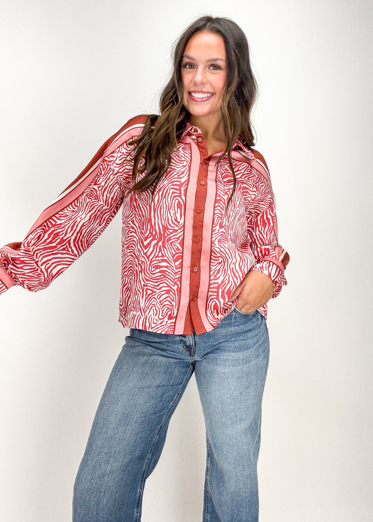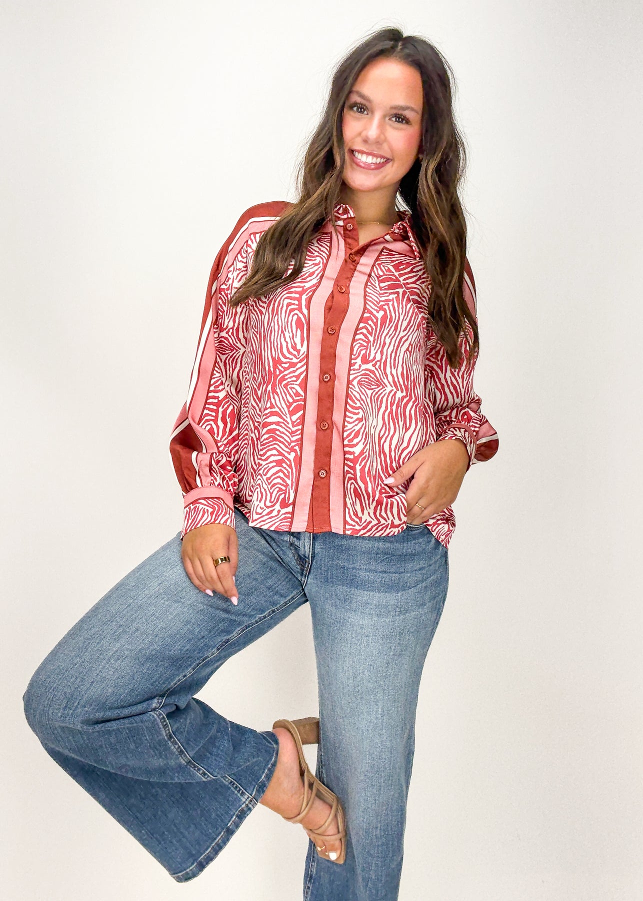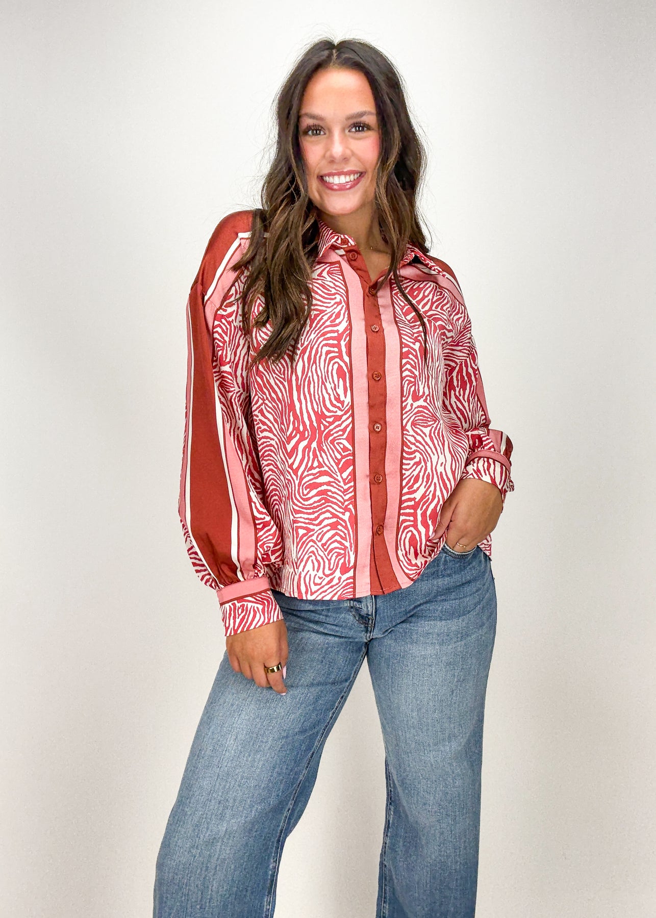 In a bold zebra print pattern, this taupe button down top is the epitome of edgy and fun.