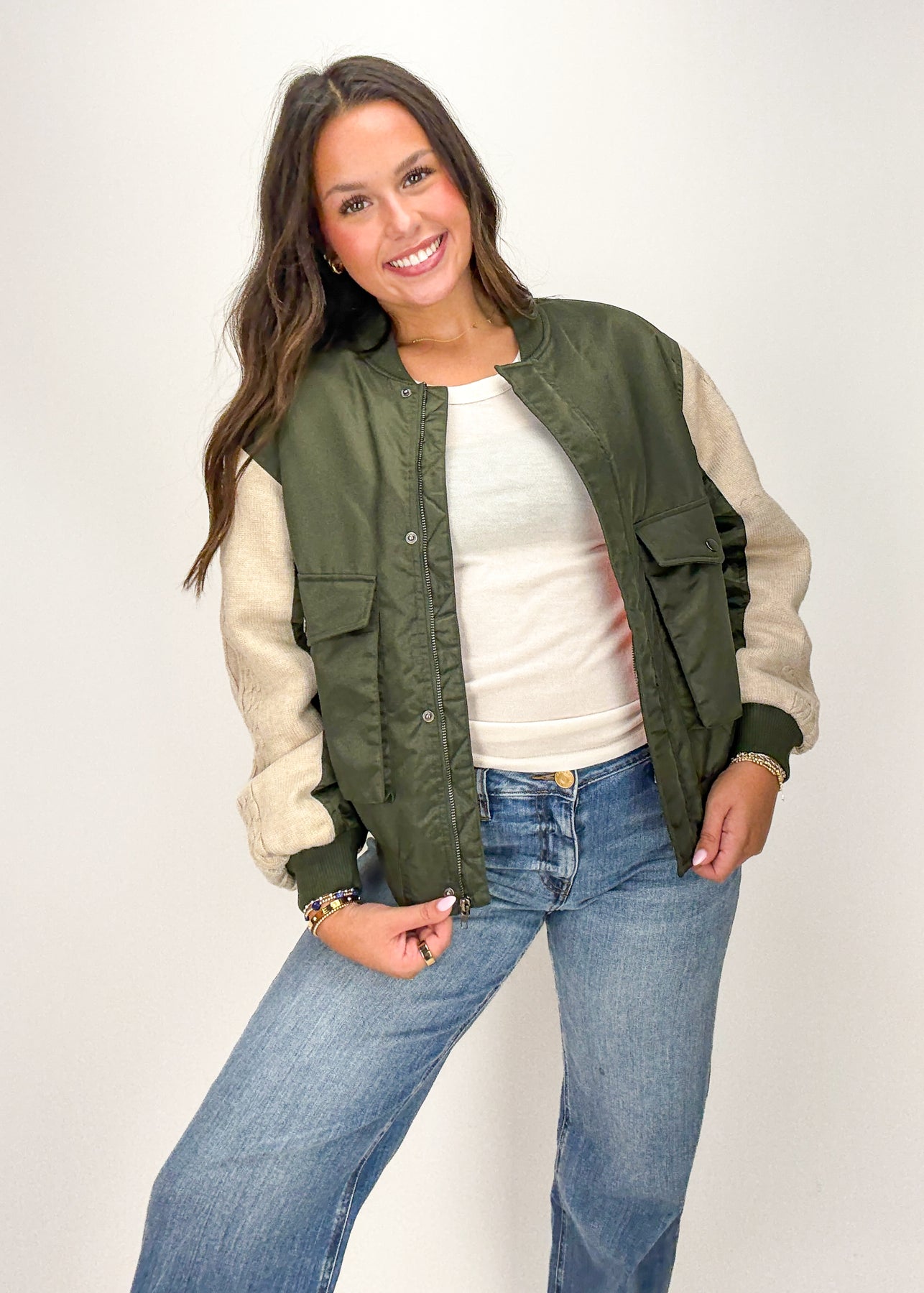 This cozy woven coat is full of personality and charm! In a dark green with cream sleeves and front pockets, it's perfect for throwing on over your outfit to give it an edgy look.