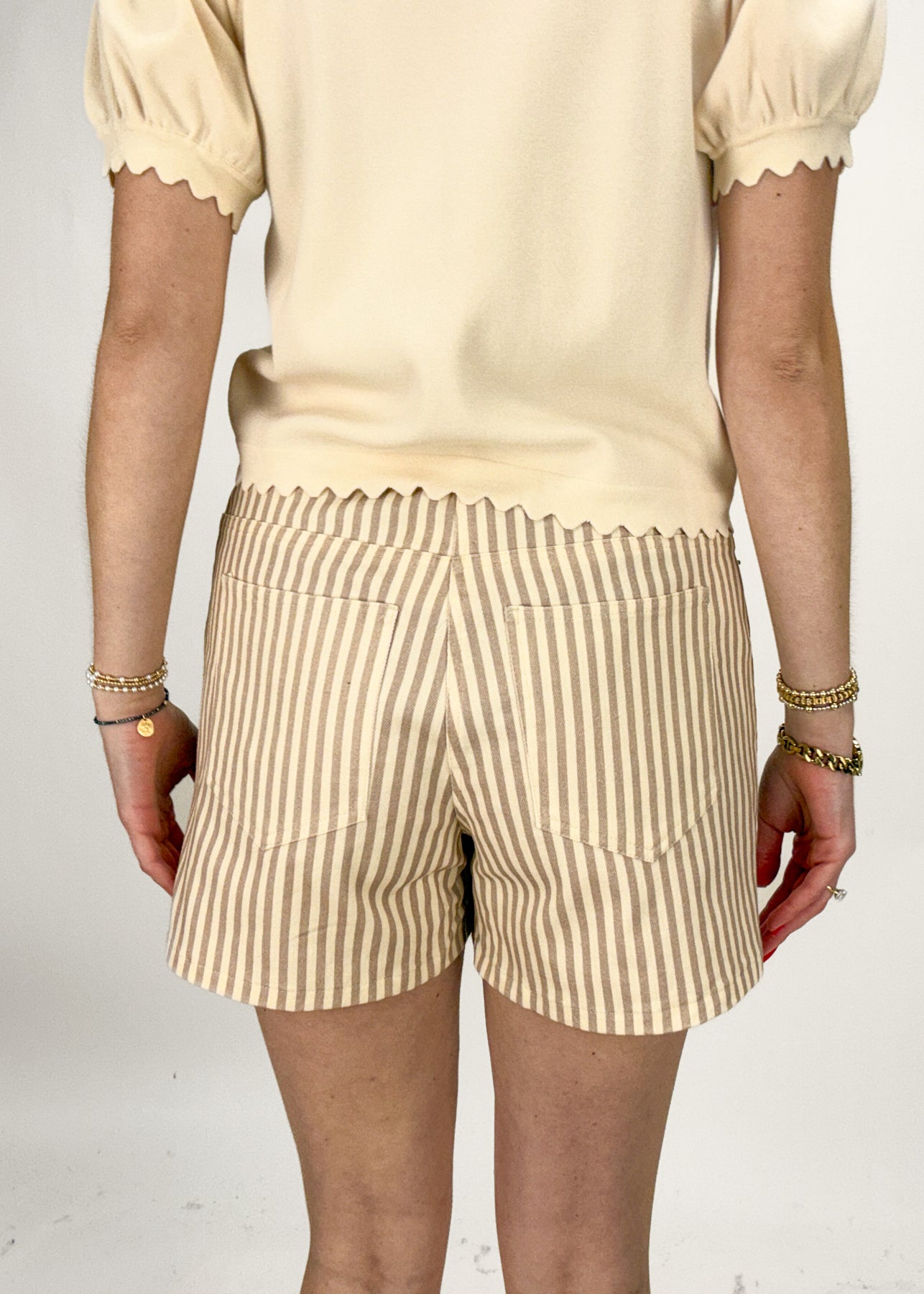 Looking for a neutral yet fun short? Look no further! These shorts come in a tan and brown striped combo that are perfect for styling with a graphic tee or a fun sweater.