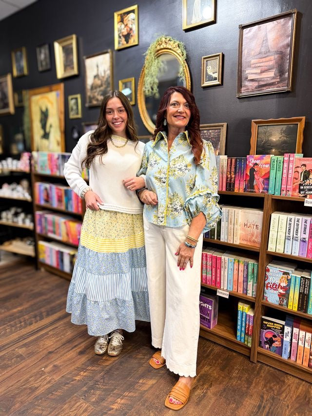 Pastels and patterns make for the perfect combination! This sky blue and butter yellow midi skirt offers a chic look with its contrasting stripe and floral patterns.
