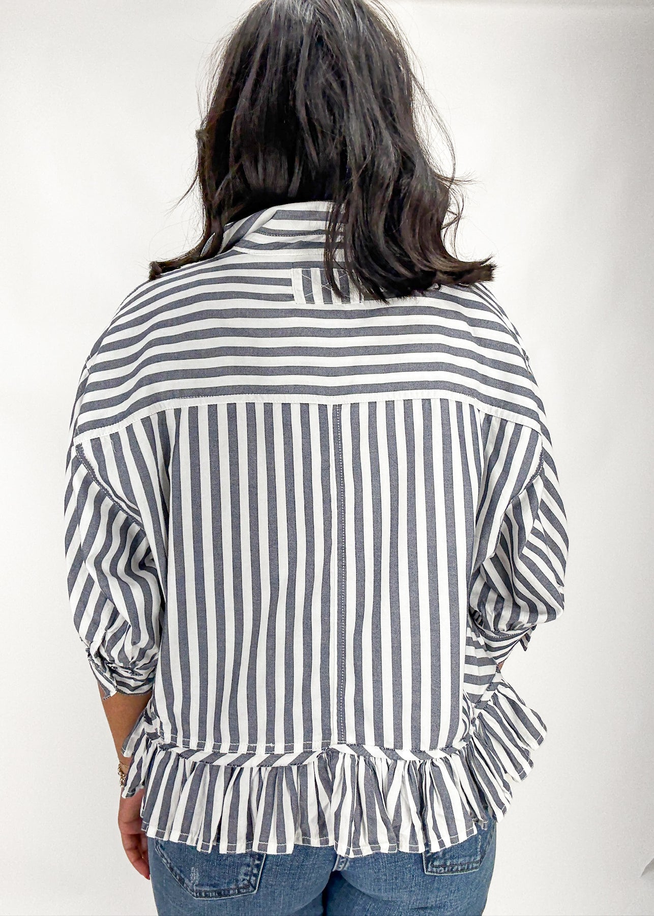 Features: Striped cotton fabrication, collared-neckline, button-front closures, drop-shoulder ¾ sleeves with cuffs, ruffled hem