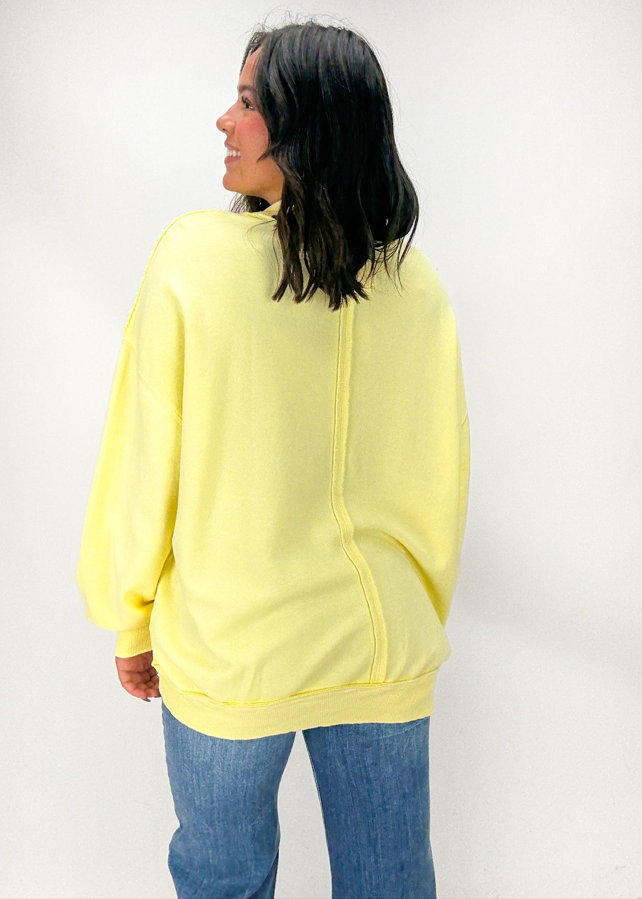 Features: French terry fabrication, mock neckline, drop-shoulder long sleeves, ribbed trim, exposed seams