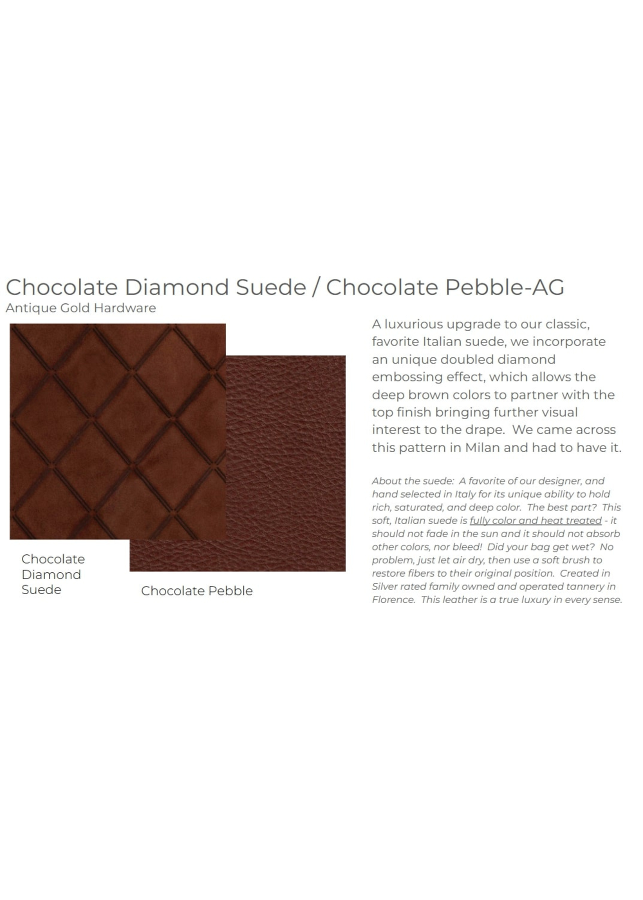 • Crafted with a deep brown Italian suede with a unique doubled diamond embossing effect and deep brown pebble leather accents