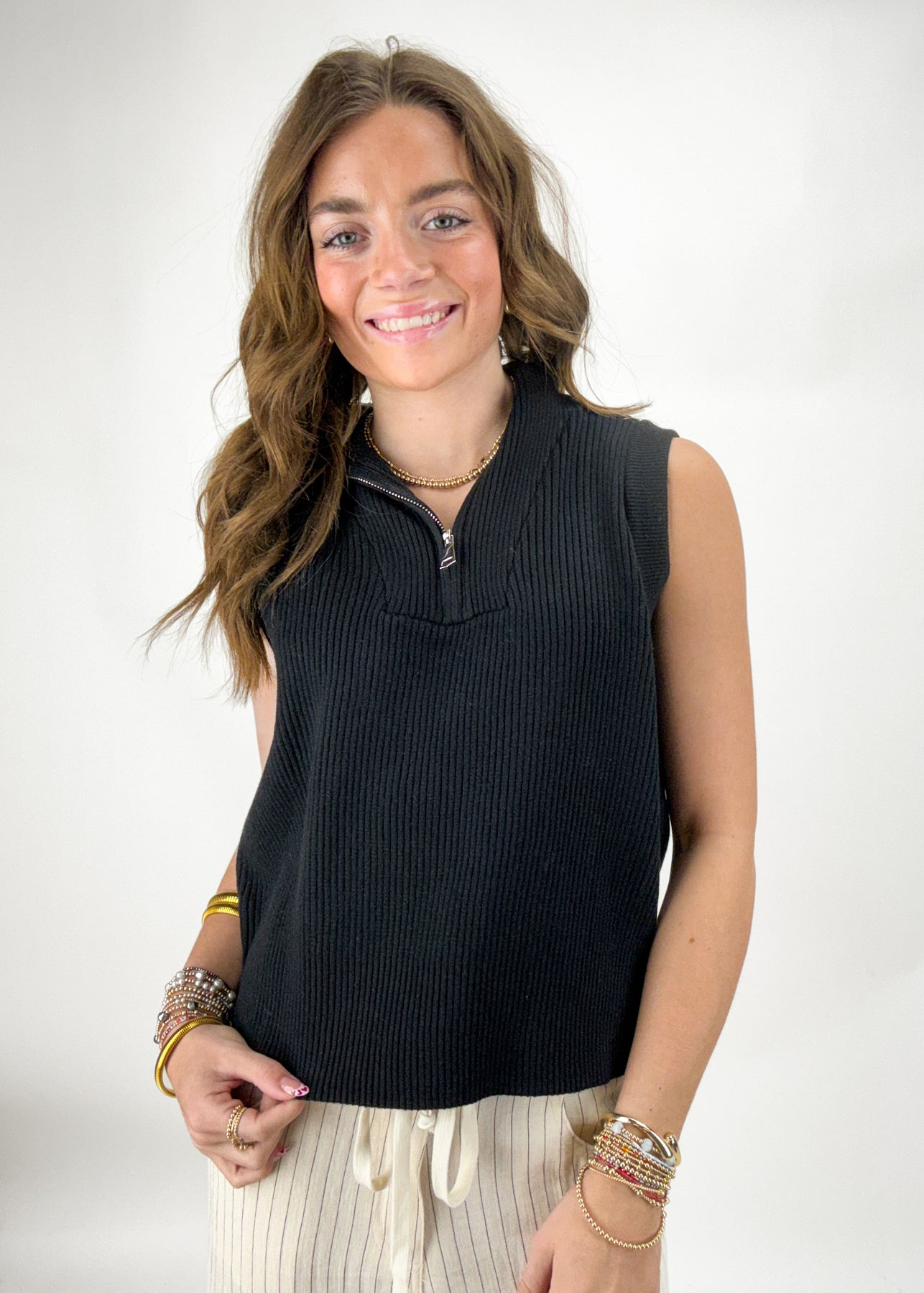 This black knit top comes in a sleeveless, half knit style and pairs well with a patterned pant or your favorite jeans.