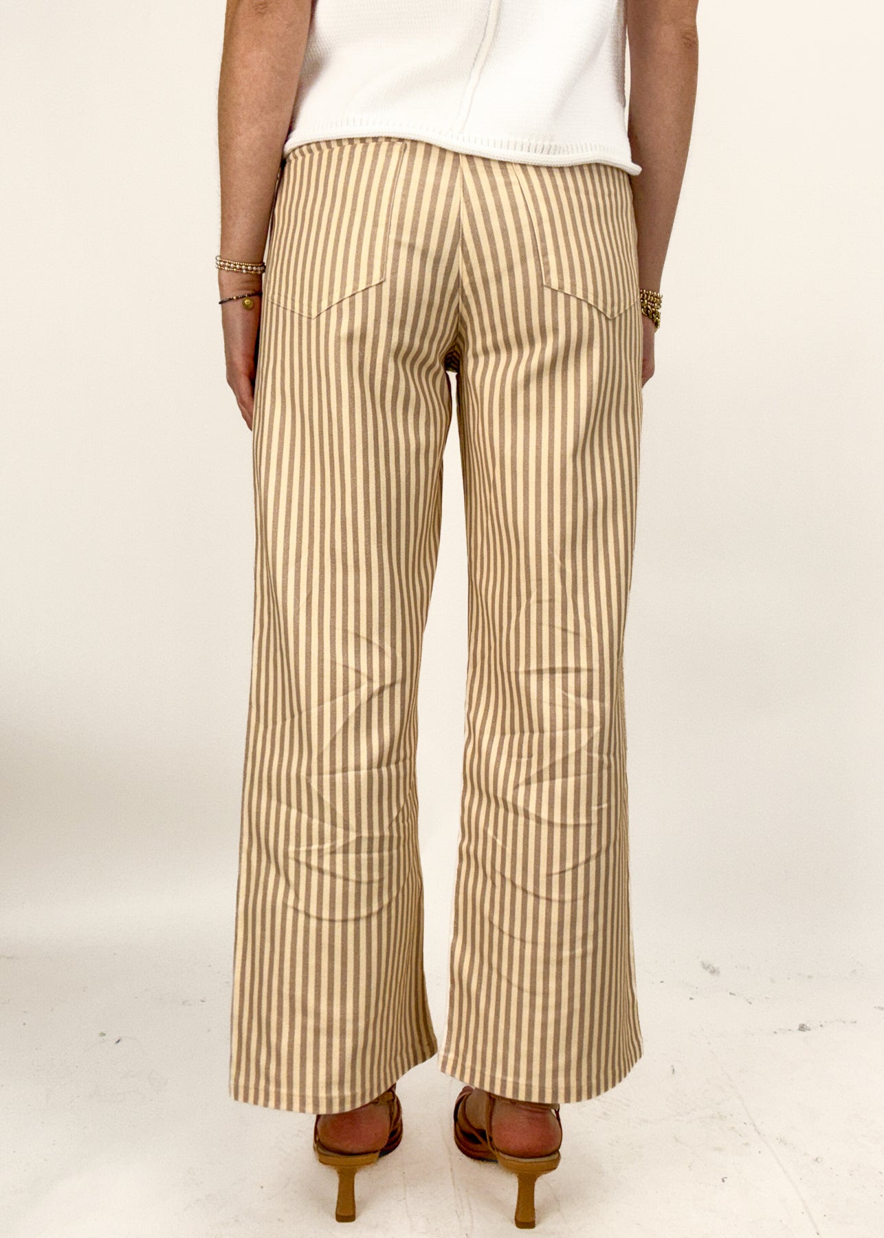 Perfect for styling with a cozy sweater or a graphic tee, these wide leg pants feature a tan and white striped pattern and are perfect for taking your outfit from good to great.