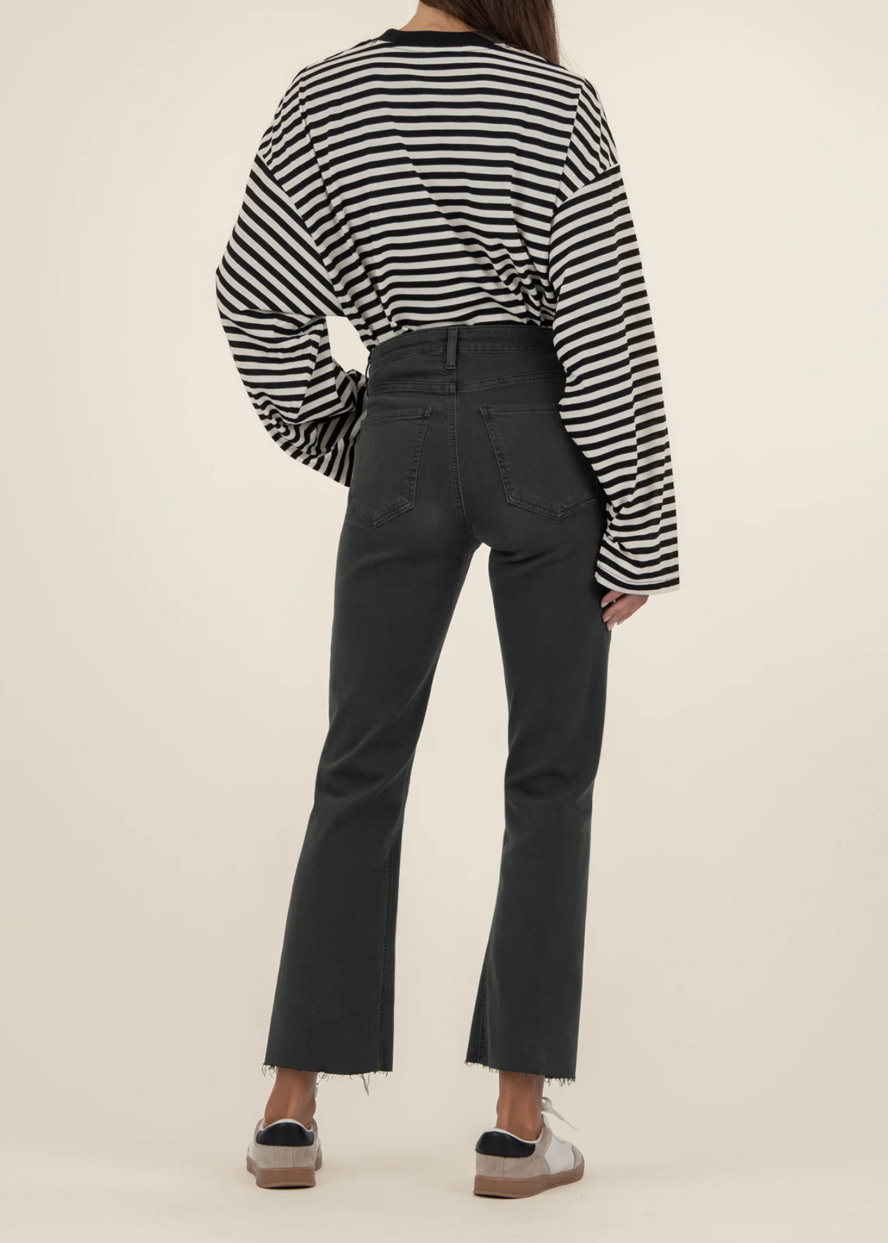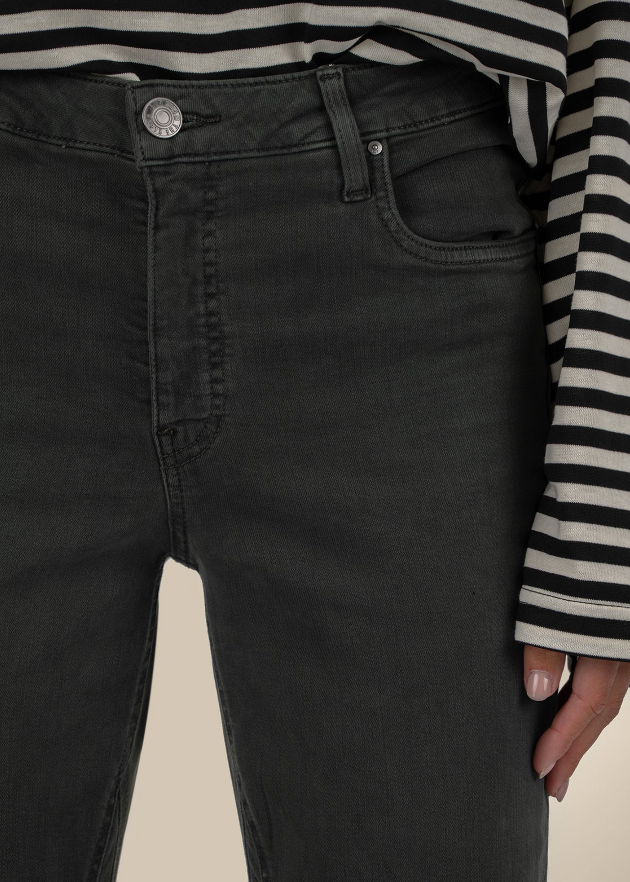 Flatter your figure with these high rise ankle flare jeans in a standout pewter green hue, designed with Fab Ab for a smooth, supportive fit. Featuring an inset leg and an edgy raw hem, they add a modern twist to a classic silhouette. The perfect pair to take you from day to night with ease.