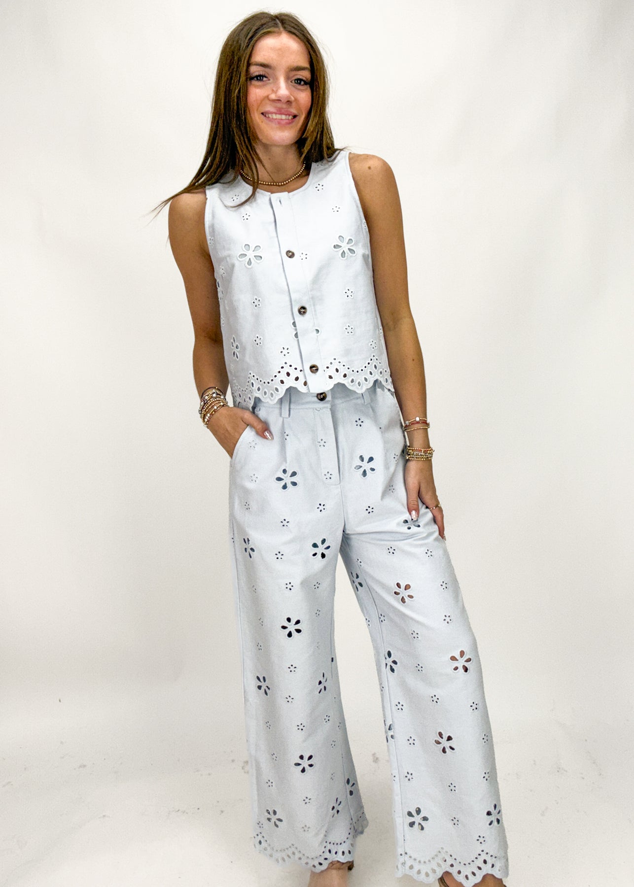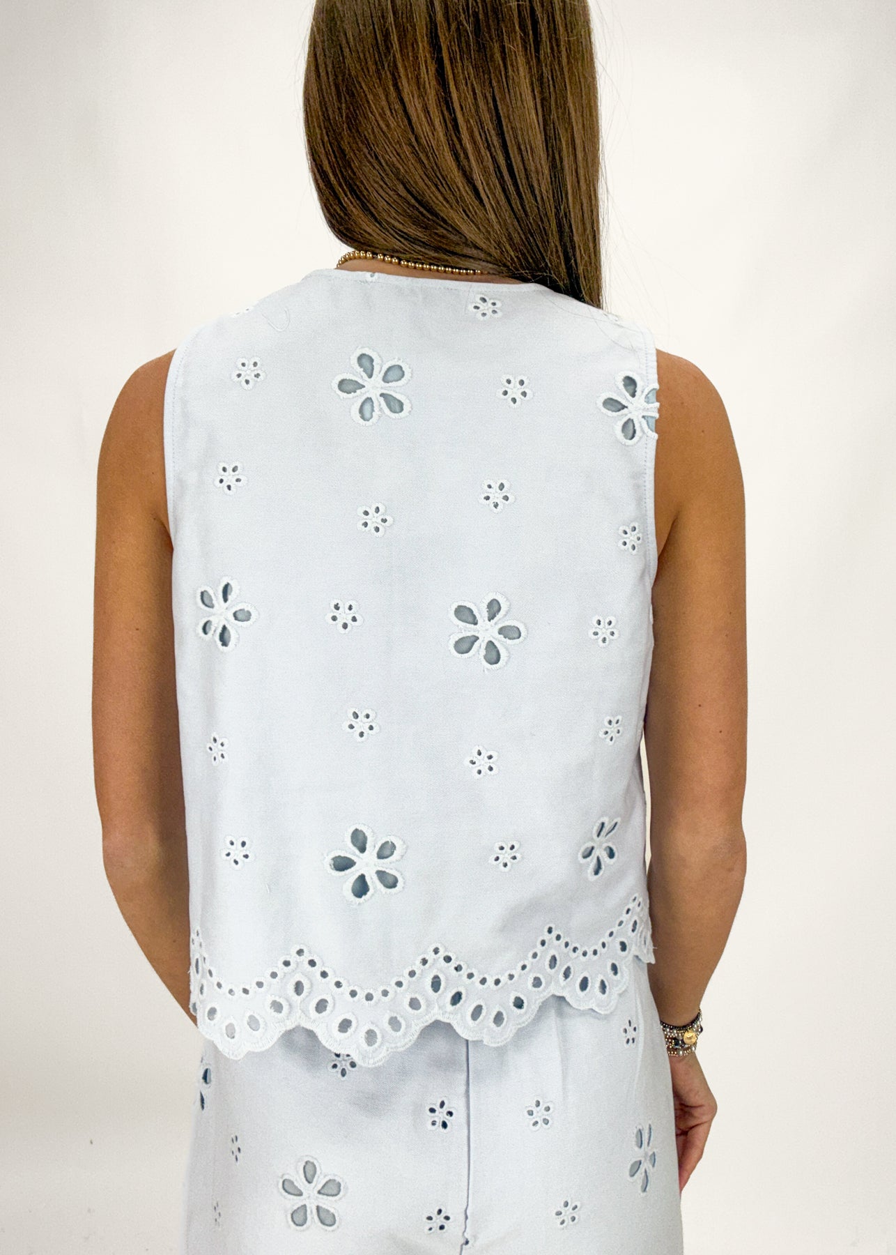Brighten up your wardrobe with this cool blue button down tank that has a beautiful eyelet floral design.