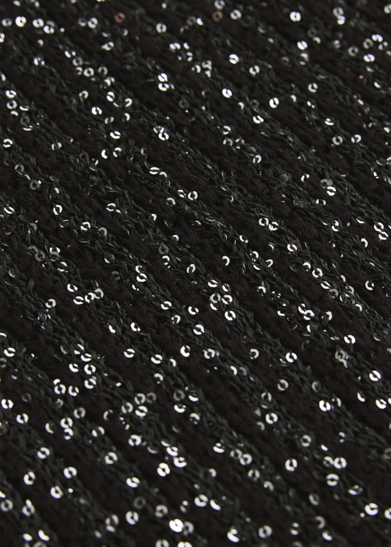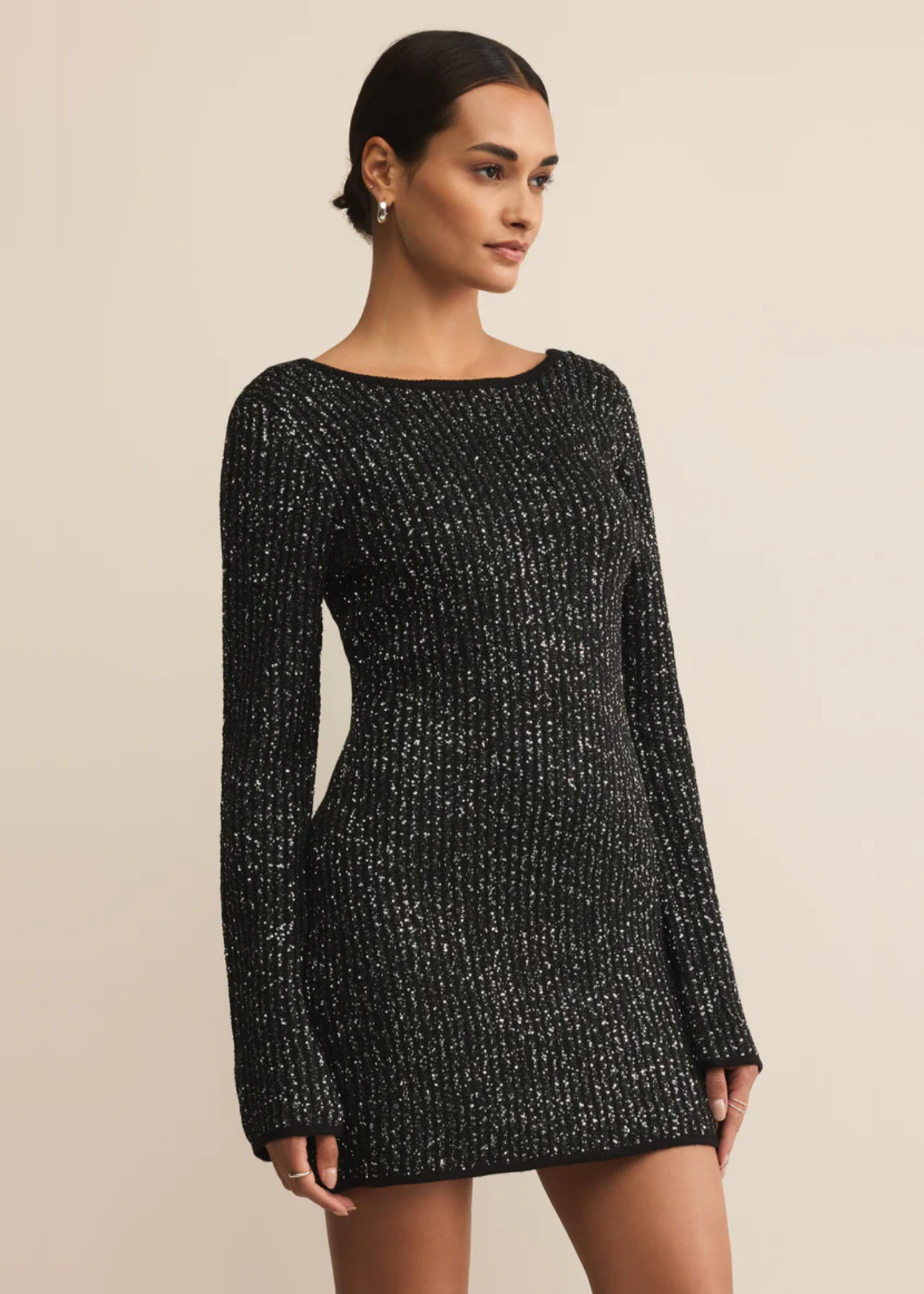 Sequins shimmer across this mini dress designed to catch the light. A scoop neck and long sleeves balance sparkle with wearability.