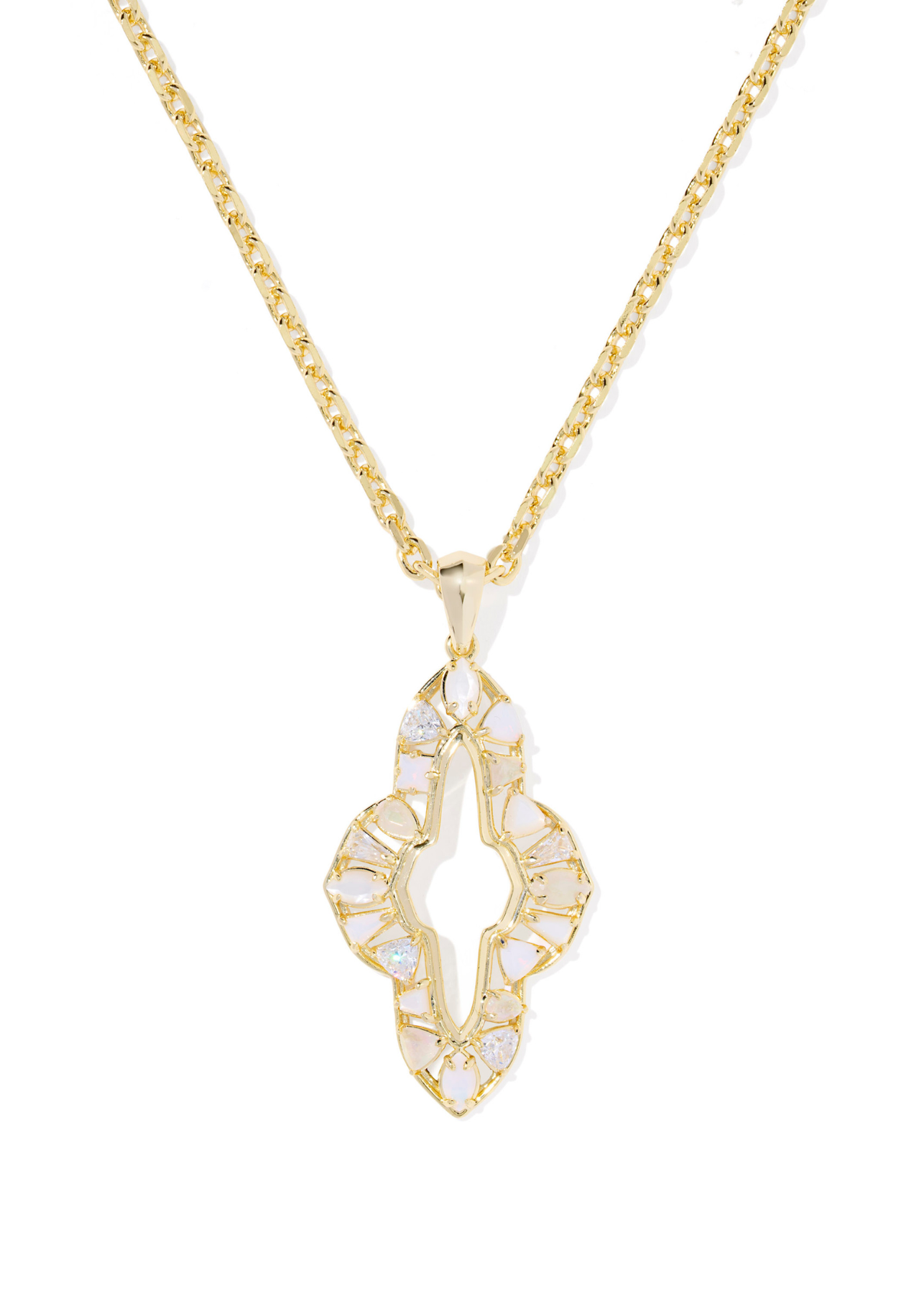 Make a statement with the Abbie Gold Crystal Long Pendant Necklace. This bold style features an open-frame pendant in our iconic shape with a crystal and gemstone border on a long chain. It’s an easy way to add some sparkle to any look.