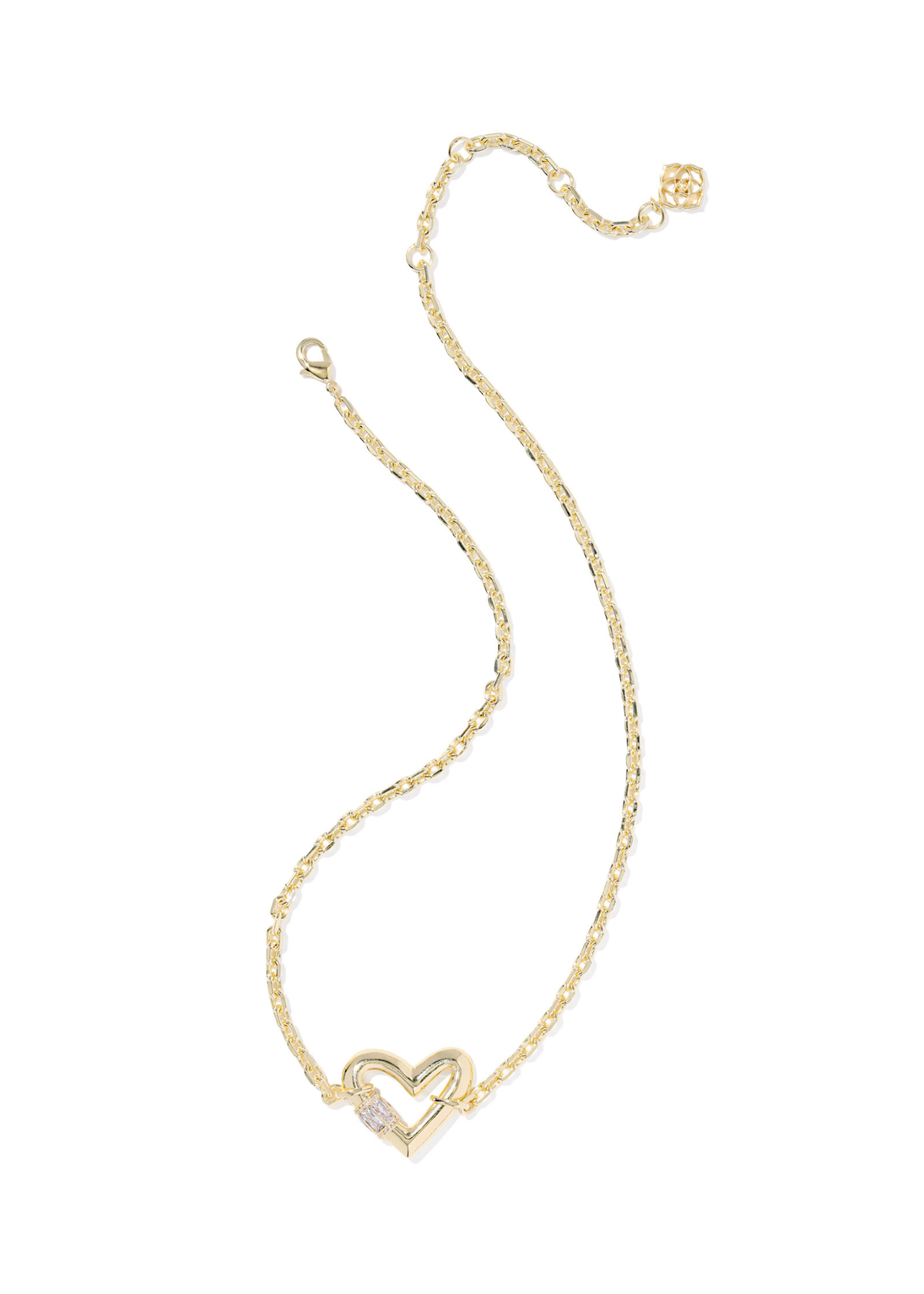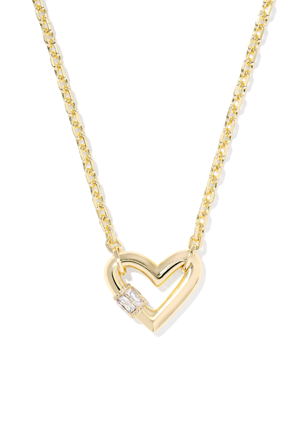 Show some love to your necklace stack with the Emery Heart Gold Short Pendant Necklace. Featuring a bold heart-shaped pendant—inspired by our bestselling Ari silhouette—studded with gorgeous baguette stones for extra sparkle, this necklace is a heartfelt take on the hardware jewelry trend.