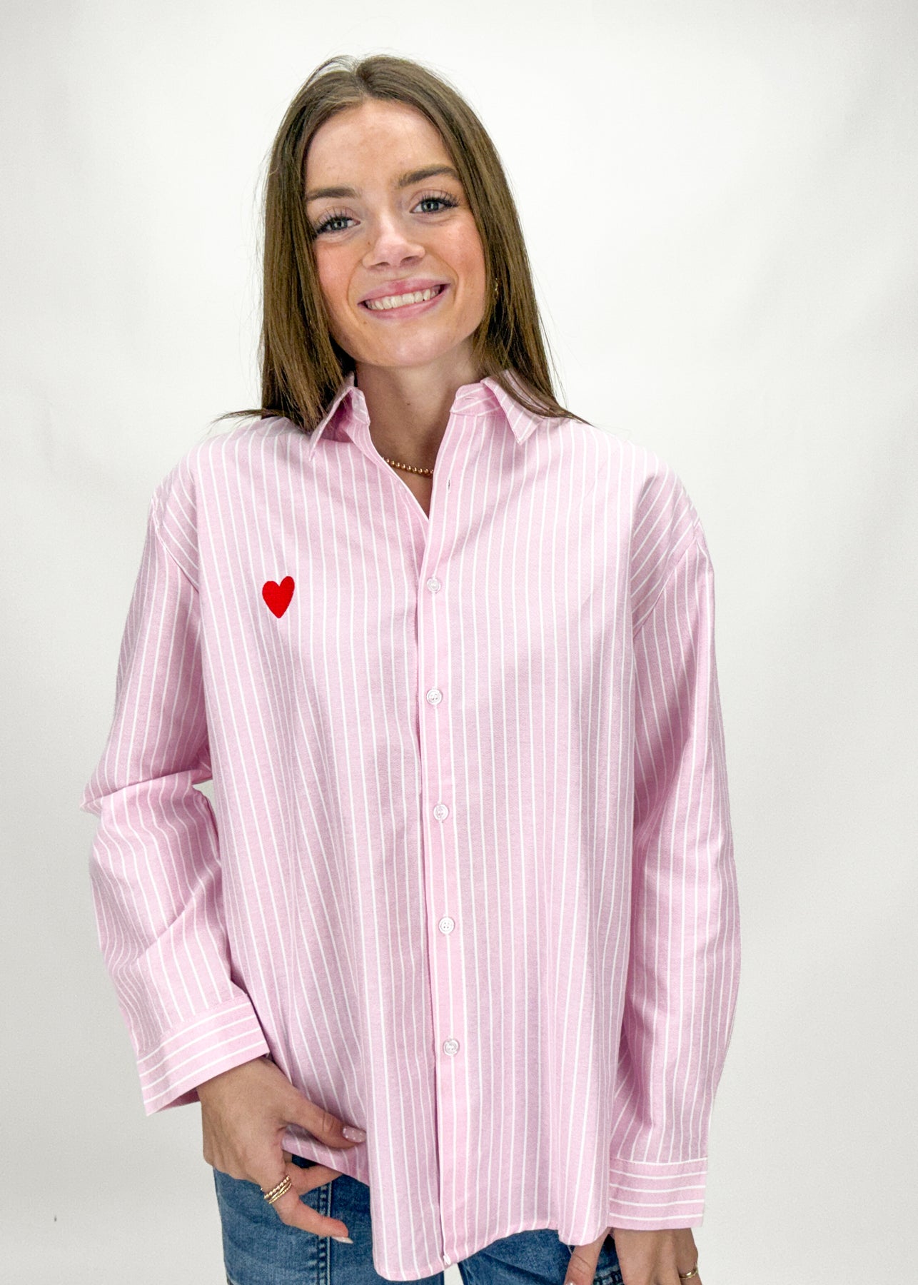 This pink and white striped button down features a red embroidered heart on the chest and is oh so chic.