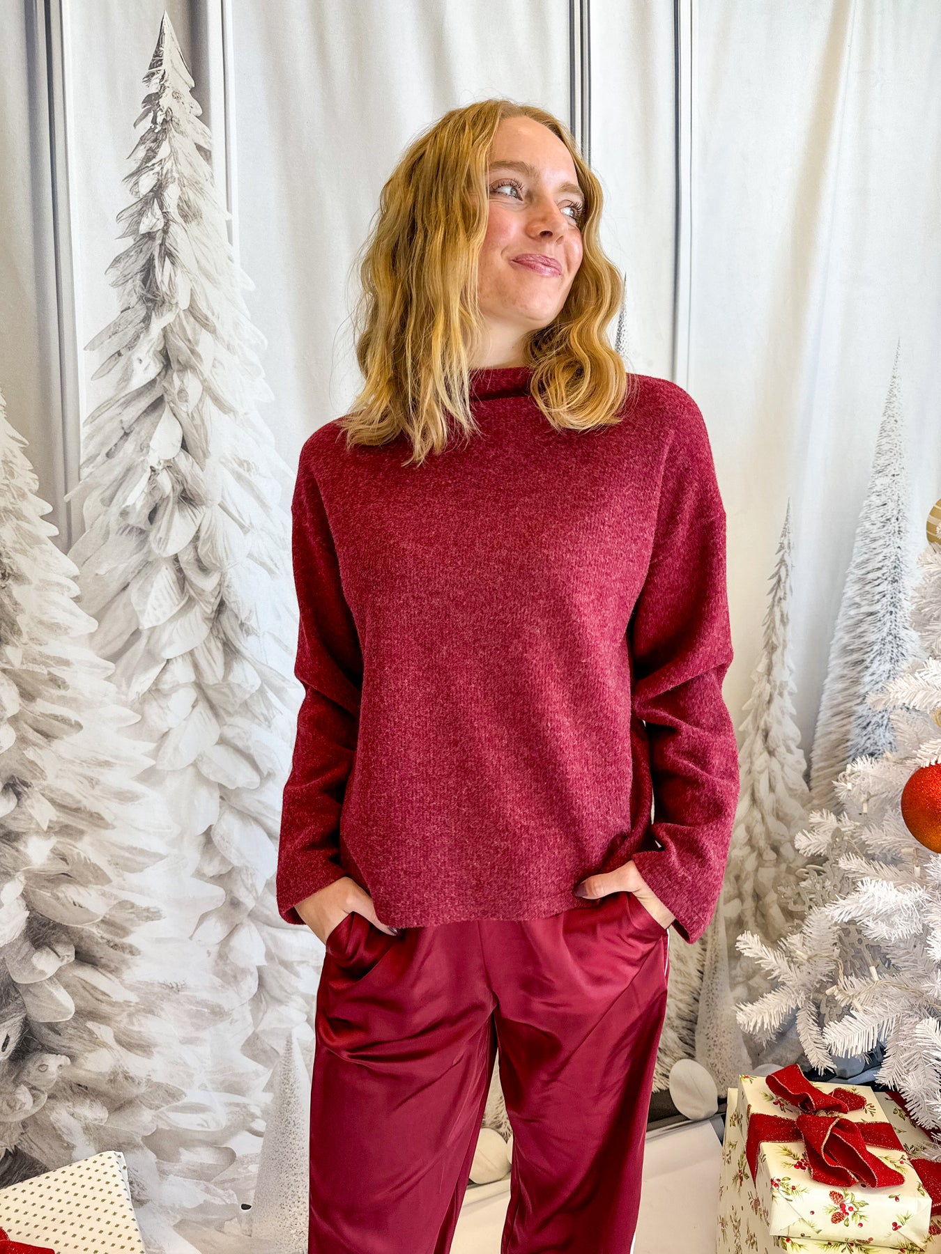 In a deep crimson red, this cozy sweater comes in a sophisticated knit that you're sure to reach for all season long!