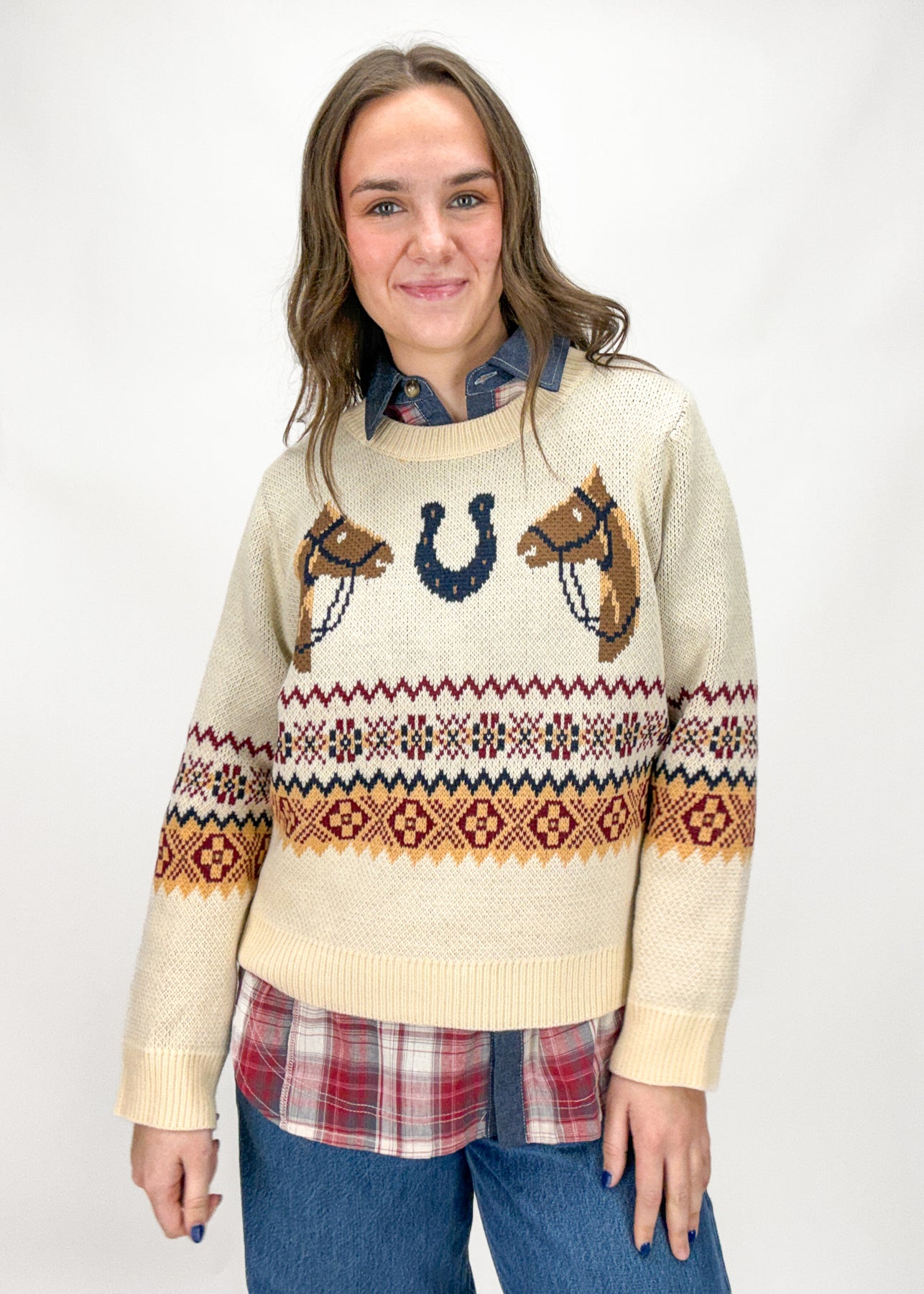 This cozy sweater features a horse head and horseshoe graphic with a fair isle pattern for an iconic look.