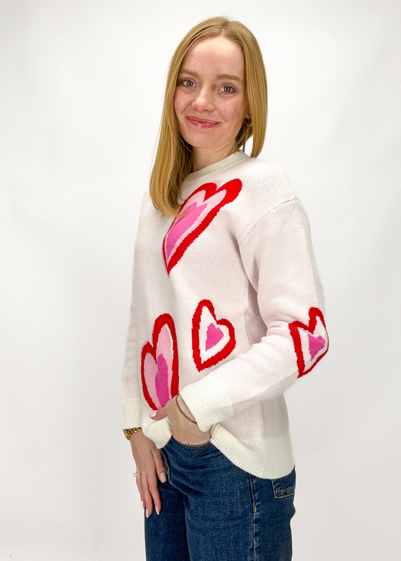 Love is in the air! This white crew neck sweater is adorned with pink and red hearts for a truly lovely look.