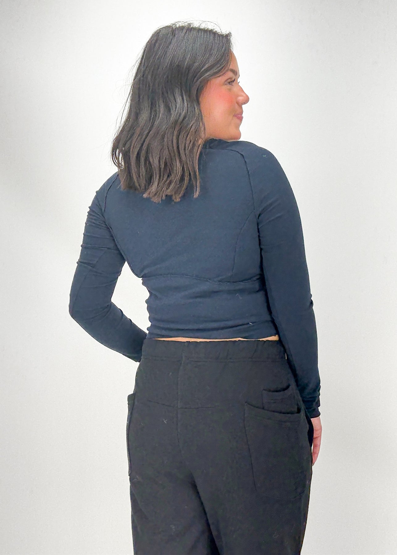 Woman wearing a navy long-sleeve top and black pants