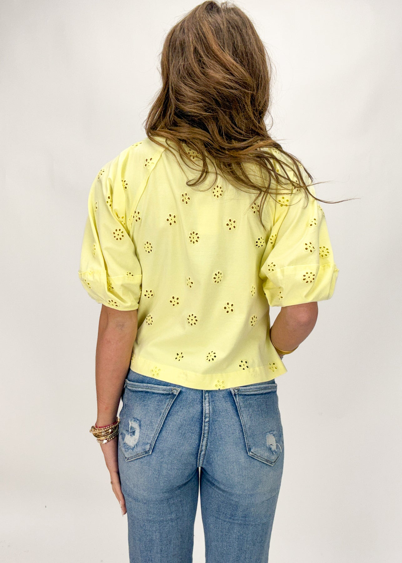 This beautiful yellow tee from Free People features a floral eyelet print and subtle puff sleeves that is sure to give your look a chic spring and summer vibe.