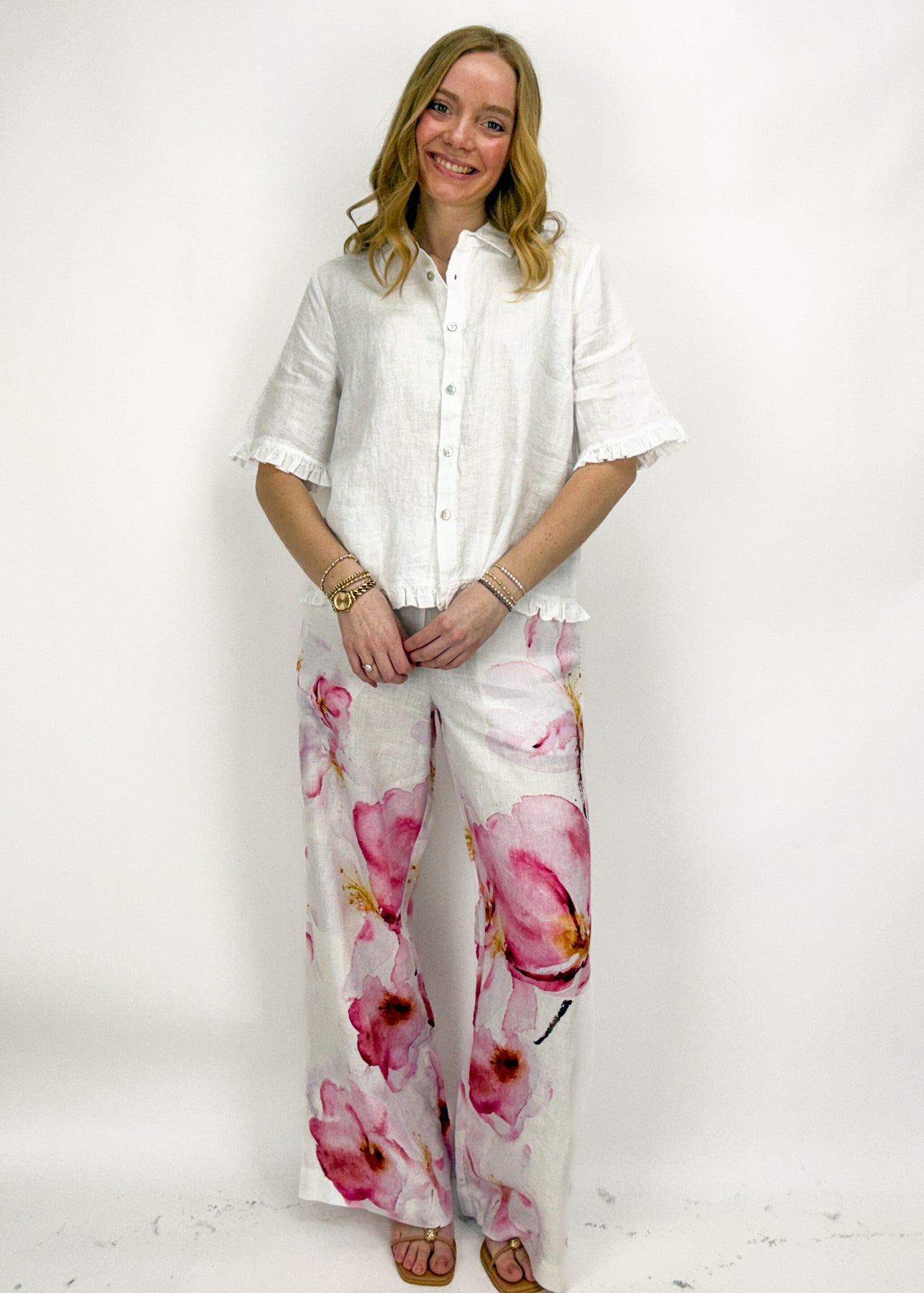 This classic white top comes in a stylish linen with ruffle accents that are oh so chic.