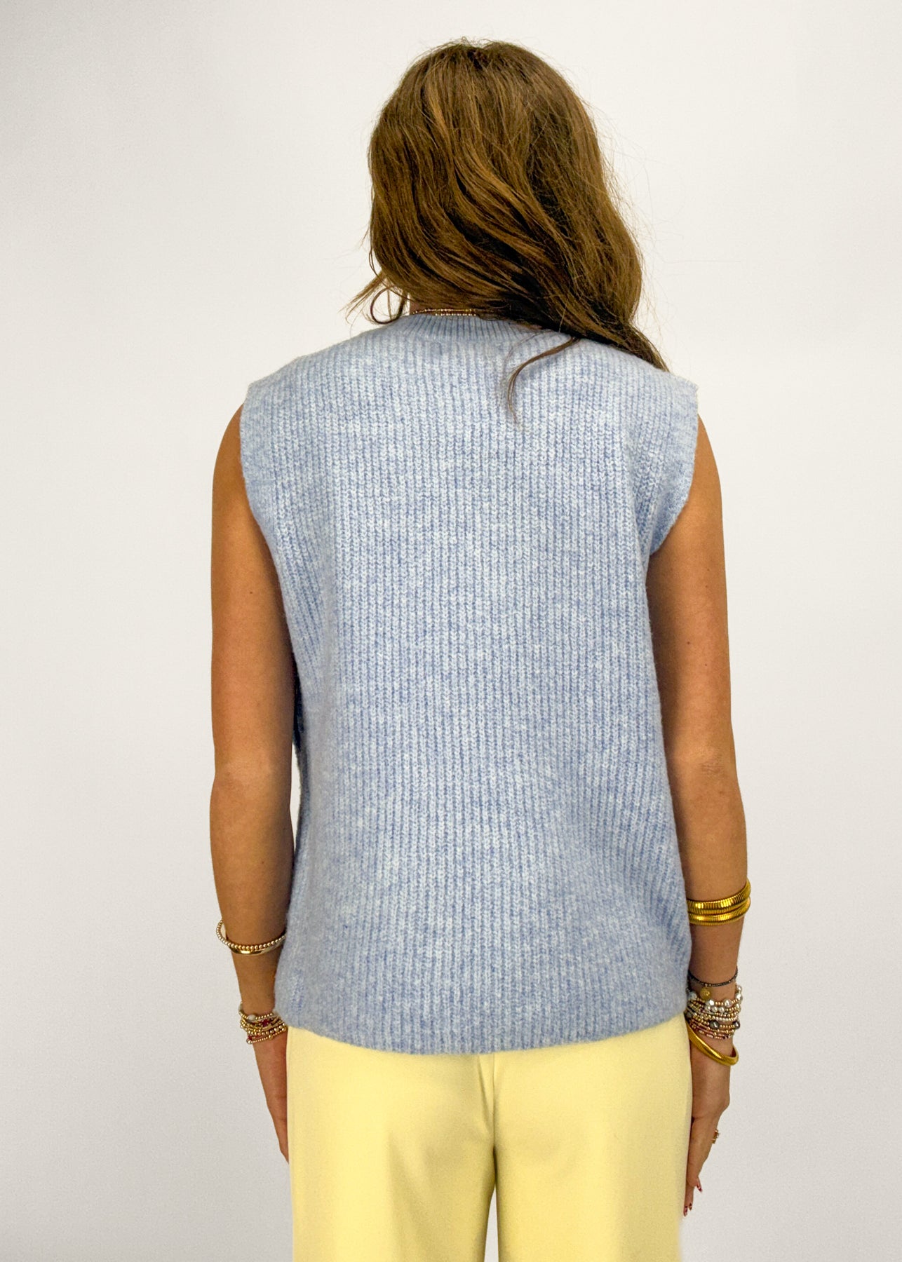 This knit sweater vest comes in a stunning blue hue and looks great styled with a white pant.