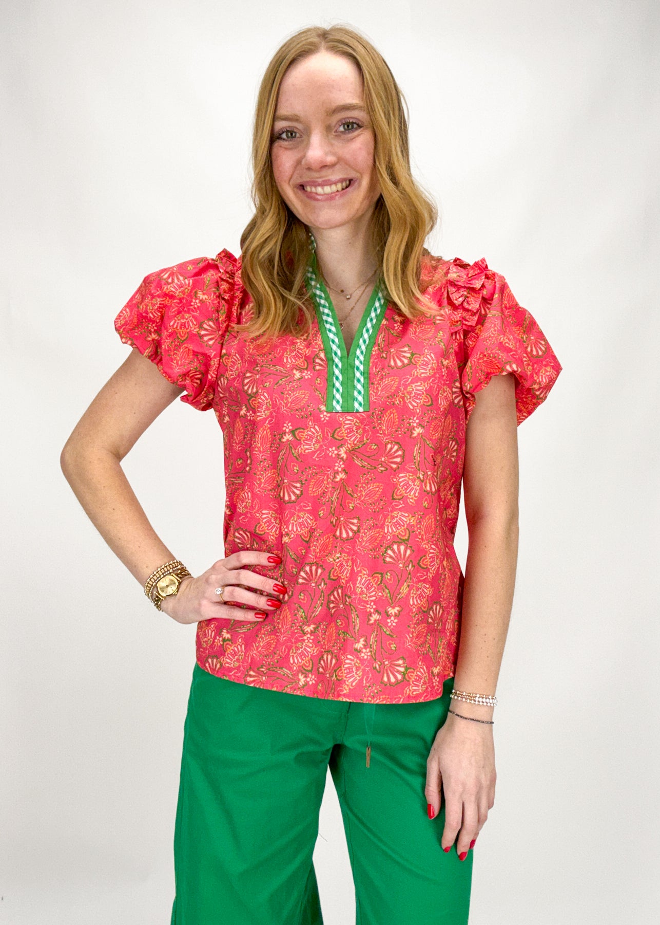 Bursting with color and character, this bold hot pink top features a fun floral print and green gingham trim. Wear it from spring into summer for an outfit you're sure to love.